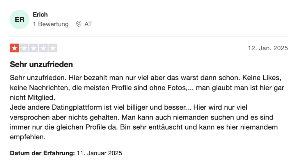 Bemängelt wird vor allem das Preis-Leistung-Verhältnis. Viele männliche User berichten von falschen Accounts und wenig Auswahl an potentiellen Partnern, was mit den hohen Premium-Kosten nicht einhergehe. Selbst haben wir keine derartigen Erlebnisse gehabt, aber das heißt natürlich nicht, dass sie nicht wahr sind. Des Weiteren ist es natürlich nicht verwunderlich, dass die Erwartungen bei dem Preisniveau hoch gesetzt sind.